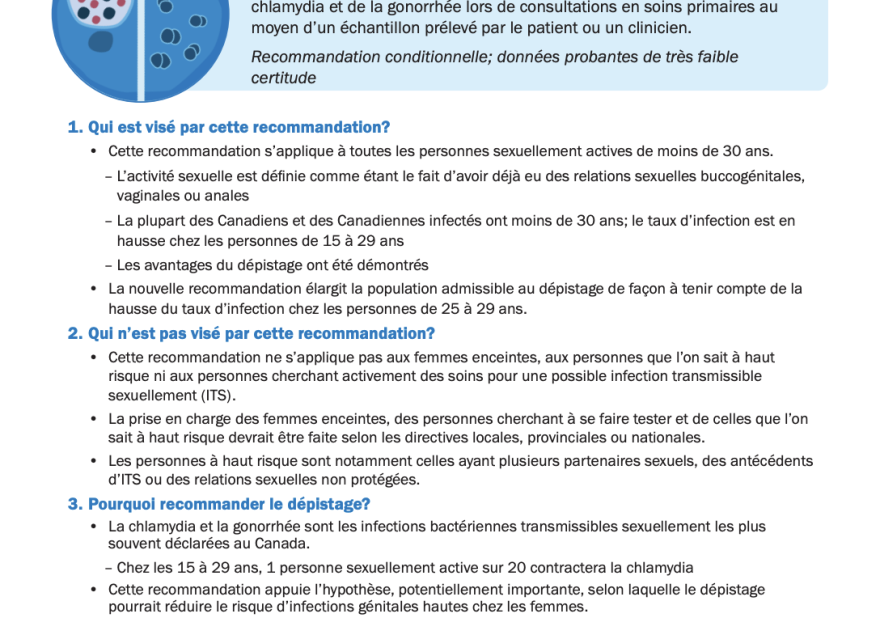 Avant chaque réunion, tous les membres du Groupe d’étude canadien sur les soins de santé préventifs (GECSSP) et du Centre d’analyse et de synthèse des données probantes (CASDP) remplissent le formulaire de déclaration des affiliations et des intérêts de l’Agence de la santé publique du Canada (ASPC) pour rapporter tout intérêt concurrentiel possible (ex. des intérêts concurrentiels financiers, d’affaires ou professionnels, intellectuels). Une divulgation est requise pour chaque nouveau sujet et les divulgations doivent être mises à jour de façon à tenir compte de tous les changements survenus depuis la première divulgation. Les formulaires dûment remplis sont versés aux dossiers à de l’ASPC. Les experts externes consultés pour commenter les recommandations et les documents préparés par le GECSSP sont également tenus de remplir des formulaires de déclaration, qui sont versés aux dossiers à l’ASPC. Pour plus d’information, veuillez consulter le Manuel des procédures du GECSSP.